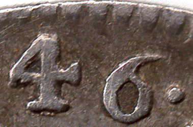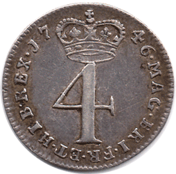 M4 - 1746 Maundy Fourpence - Date: 6 over 3 (new and unlisted in any catalogue or reference book, as yet !) Probably extremely scarce as in the past every 1746 4d I have seen has had the normal (no overdate) type of reverse. This overdate is known for the 3d & 1d. As yet not found for the 2d. I have included on this page the reverse style of the normal 1746 reverse and that of the overdate. It is clear that they are different. On the normal the 46 are closer together. MAG starts close to the colon dot higher up. The R of FR & the E are below the foot of the 4. The legend on the left is well spaced and there is plenty of space for the .17 The 1746 overdate reverse is that of the 1743 reverse die that has been re-used and the 6 added on top. There has been discussions and comments in reference books that the 6 is over a 5. I wish to refute that myth when you have a coin as mine that clearly shows the back bar of the 3 ! It is understandable in some way for examples that did not have a clear back bar to jump to the conclusion that the 3 was a 5. But it appears that none of these researchers thought of where the 5 came from - as there never was a 1745 Maundy 4d; 2; or 1d ever made. If they had thought of comparing the reverses of the 3d & 1d on the overdate with that of 1743 they might have found that they were the same and errors in recording incorrect data would have been avoided.