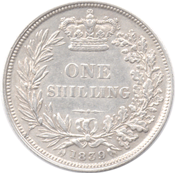 1839 Shilling - 2nd issue - 2 + A (D. 853) EF?-EF Bright Obv. Only the top colon dot after BRIT~IAR º is visible - no trace of lower colon dot. Date: '839' double struck, especially noticeable on the 9. The 1 has NOT been re-entered ! ** We have now obtained another example of the lower colon dot after BRIT~IAR º missing but only in Fair condition. This confirms that this error die was used for some time.
