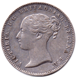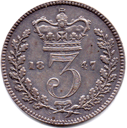 ST 1847 DA - Obv.1 (F: D: type - A) Rev. A2 Left tie ribbon and wreath stalk partly struck * Date: All numerals - Large Grade: EF? Grey tone. SOLD * I have only ever had four examples of this extremely rare date and as I did not take much notice, previously, I cannot determine how many had full or part left tie ribbon & wreath stalk. See 1846 part left ribbon & wreath stalk. At least one other 1847, that I have the scan of had full left ribbon, etc. At present I have two examples in stock and this example has the left tie ribbon and wreath stalk only partly struck or missing (as per my two 1846 examples). It is difficult to know if this is a ex-Maundy coin or a choice currency coin. I feel that this coin is more likely have been a currency issue. Whether it is Ex-Maundy or currency it is still extremely rare and highly collectable !