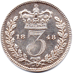 ST 1848 Ab - Obv.1 (F: D: type Ab) V over V in VICTORIA. Very slight scuffing on Victoria's neck and field Rev. Very fine traces of scuffing in field on clear when coin is angled Date: Large. 1st 8 is slightly double struck. Grade: Obv. EF-EF+. Rev. EF+ Bright and slightly proof-like. It is difficult to know if this is a ex-Maundy coin or a choice currency coin. Whether it is Ex-Maundy or currency it is still extremely rare and highly collectable !