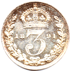 ST 1891 M 7 + C (Maundy) Obv. Choice proof field, etc. but with slight scuff marks. Die clash from the reverse die - shows with reverse of the 3 from Victoria's chin curving downwards to just below Victoria's necklace. Also a trace of the (reverse) crown showing just to the left of the back of Victoria's head and crown. Rev. Die clash from obverse die with Victoria's head showing clearly with her nose at the 9 of '91' and the back of her veil through the 8 of '18'. This die clash has caused a very weak lower band to the Crown. Grade: Choice proof with only slight scuff on obv. field. Light tone EF+/pAS