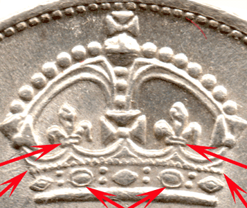 ST 1904 A & B - Rev. A - The features of the Crown are weakly struck. The Fleur de Lis & band below, the Arches below, the Pearls below and the Jewels below the pearls. ST 1904 C & D - Rev. B - Several features of the Crown have been sharpened up. The Fleur de Lis have been sharpened up - especially the band below. The Arches below the Fleur de Lis have been sharpened up. The Pearls below the arches are now clearer circular dots. The several of the Jewels, below the pearls, have had their centres sharpened within the settings. * A minor enhancement of this reverse die (B) that has not been noticed before. A similar enhancement occurred with the Victorian old head dies in 1899
