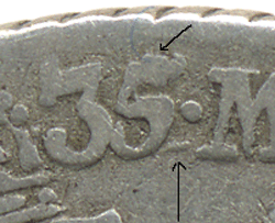 Date: The 5 is over a 4. It is not completely clear but one can see the foot of the 4 - just to the right of the base of the 5. The top of the 4 also visible just above the top bar of the 5. A tiny bit of the 4 remains just below the top bar and bulge - close to the upright bar. A fairly newly found variety.