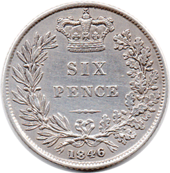 1846 Sixpence - Obv. Die crack between I & C of VICTORIA & B & R of BRITANNIAR Very faint hairline scratch horizontally across Victoria's cheek, from base of nose to ear. Rev. Slightly scuffed. Date: Type C (see 1846 variety list) Grade: EF Greyish tone
