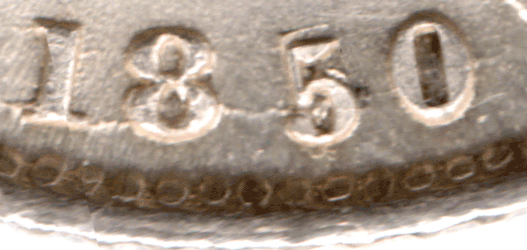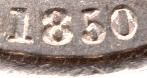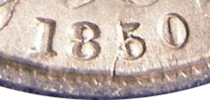 1850 sixpences have two date widths - Normal spaced and wide spaced. The wide space 1850 sixpence has, so far, only been seen with 5 over 5. There is reportedly a variety 1850 with 5 over 3 - this seem extremely unlikely as it seem unimaginable that a reverse die for "183" still exists and if one looks the 3 that will be used in 1853 is ROUND topped ! Plus the 5 has a die crack running through it - which is probably what this variety of 1850 sixpence is - A die flaw !