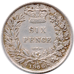1866 Sixpence - Obv. Die cracks through I of DEI, through 1st A of BRITANNIAR & between 6 & 7 o'clock, just to the right of the tip of Victoria's truncated neck Rev. Trace of ghosting of Victoria's head (due to clashed dies) Die no: 24 (see 1866 die number list) Bright VF+-EF? (closer to EF?) Trace of toning in legend & wreath