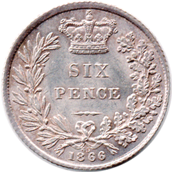 1866 Sixpence - Obv. Trace of ghosting of wreath (due to clashed dies) Die crack through 2nd A of BRITANNIAR Rev. Ghosting of Victoria's head (due to clashed dies) Die no: 45 (see 1866 die number list) pAS Bright with choice light toning
