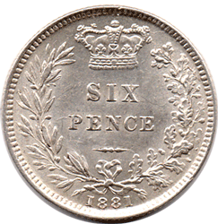 1881 Sixpence A - 6 + D Obv. Faint hairline die cracks in left field, from truncation up to chin. Through most of VICTORIA connected to base of DEI, then the top of GRATIA & into BRIT~ and down to F: D: - Virtually the whole way around the dge of the coin ! Rev. Faint ghosting of VICTORIA's head (due to clashed dies) Date The date has slightly small numerals EF+ Bright