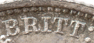 SX 1887 H - The I is over the leg of R - note that the right foot of the R is broken. This could have been a simple error of repairing the wrong letter but as the I does not appear to have been repaired and as it is only the right side of the foot of the R that need repair the repairer may have decided to use the I for repair. It is possible that he might have used a one size smaller font as the repair with the I is both short of reaching the broken foot of the R and is also slightly short of the top of the R. As no other part of the R is doubled that also suggests that it was an I used rather than an R over R repair. This variety is not listed in Davies or the 'new' English Silver Coinage. This coin has a choice Greenish, slight reddish tone (bust area) tone - pAS