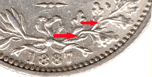 SX 1888 A - with reverse B - The branch on the right side of the wreath, where the 2nd leaf leans to right there is a small 'bit in the centre that attaches to nothing. The branch at the bottom curls upwards as if connected to the leaf that points upwards. The continuing branch points forwards to the next leaf that leans right - the branch above does not appear to be in line or connected to the branch below ! * This reverse seems to be fairly scare. SX 1888 B - with reverse C - The branch on the right side of the wreath, where the 2nd leaf leans to right the leaf now has a strong connection to the branch. There is a hairline centre stalk that appears to connect to the upwardly pointing leaf. The branch at the bottom is now very much stronger and appears to be continue under the back of the leaf, leaning to the right and connect to the branch above. That was not to clear in reverse B. The continuing branch curves slightly upwards to just behind the next leaf that leans to the right and appears to connect to the branch above. * This reverse seems to be the commonest/normal for the issue. SX 1888 C - with reverse D - The branch on the right side of the wreath, where the 2nd leaf leans to right the leaf now very clearly splits in 3. It appears as an oval with a line running through the centre. The top stalk is for the leaf that leans to the right. Both the centre and the bottom branch/stalk seem to go towards the leaf pointing upwards. There then appears to be two branches. The lower one going - nowhere ! and the one above is the branch continuation. * I have now managed to purchase a 2nd example of this unusual reverse type. (Feb. 2018)