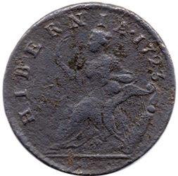 1723 - Wood's Hibernia - Halfpenny (Normal flan 25 mm) [7.7 grams] Rev. NO Stop before HIBERNIA (Normal type) Grade: Fair £25.00